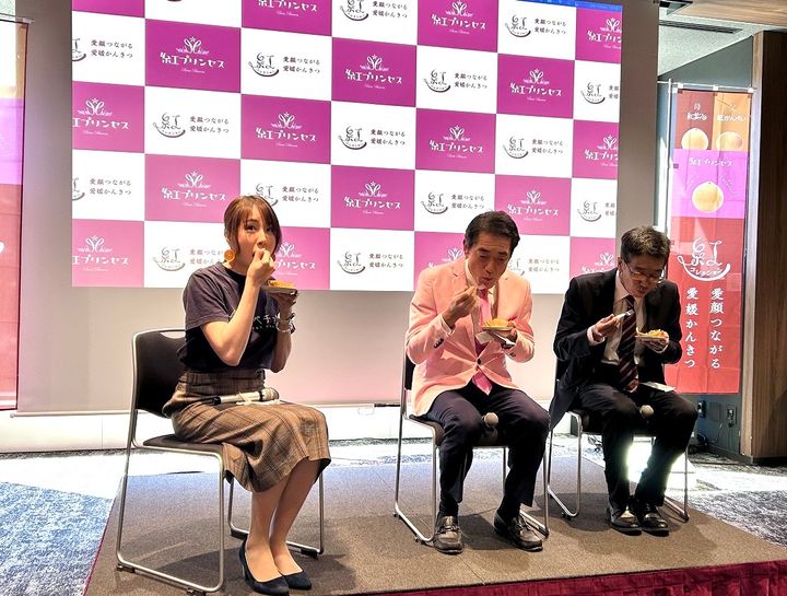 登壇者3名によるトークセッションでは、まずは食べてみないと始まらないということで、「紅プリンセス」の試食からスタートしました。