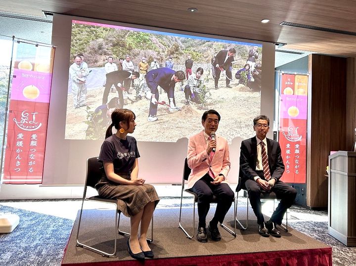 登壇したのは、中村時広愛媛県知事、愛媛県みかん研究所の藤原文孝所長、オンライン直売所「食べチョク」を運営するビビッドガーデンの秋元里奈社長の3名。また、愛媛県イメージアップキャラクター・みきゃんも駆けつけてくれました!