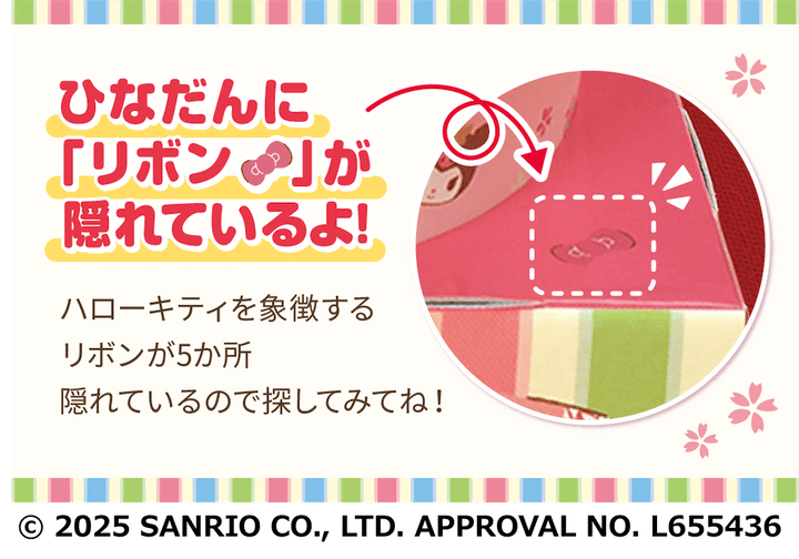 ひな壇には、ハローキティをイメージしたぼんぼりやひなまつりのモチーフがちりばめられ、ひな壇の背面にはサンリオキャラクターズが勢ぞろい。