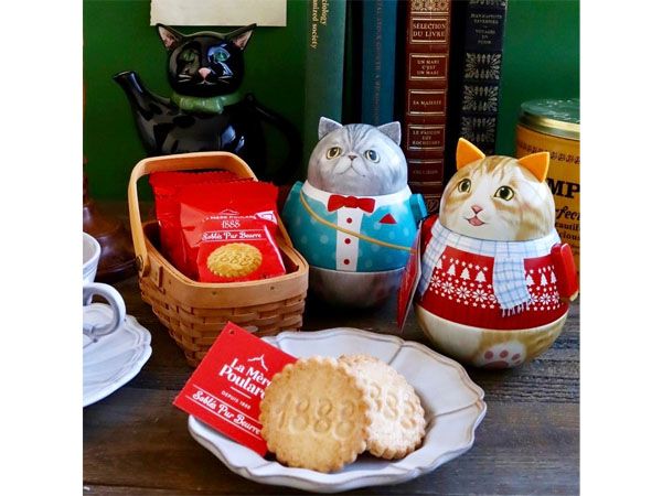 猫の形の起きあがり人形缶。英国シルバークレイン社製のかわいい猫の形をしたキャット缶に、ラ・メール・プラールのプチサブレが入っています。「起き上がり小法師」のように、コロコロと揺れて動くのがかわいいケースは、中身を楽しんだ後も、缶はディスプレイや小物入れとして使えます。