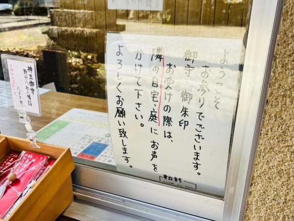 御朱印をいただくには通常社務所に人がいらっしゃいますが、留守の際には隣のご自宅へと「ピンポ~ン」と伺います。