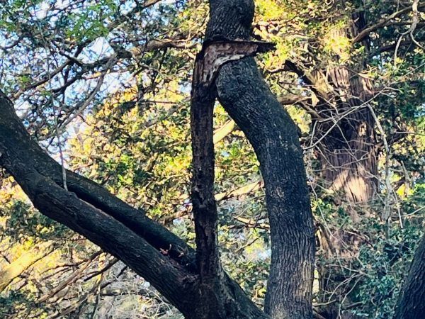 一点を見つめる鳥に見える与一の里おおたわら名木の枝