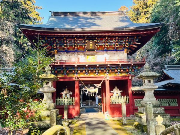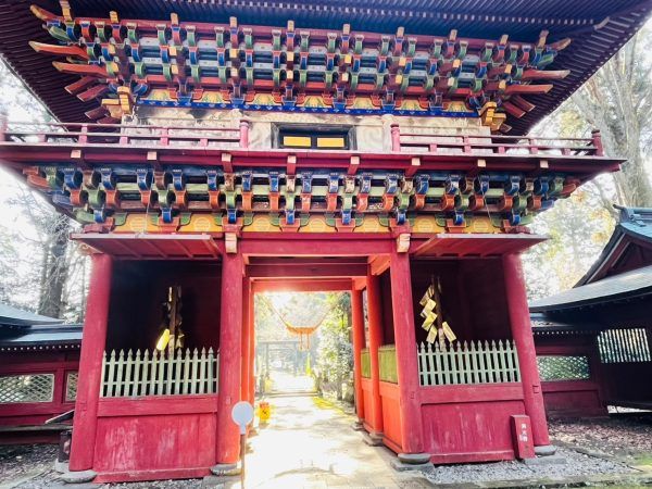 本殿からみた「楼門」美しい色彩に龍の絵が描かれています。