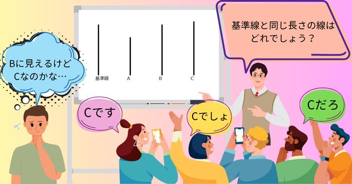 アッシュの同調実験のイメージ。サクラが皆間違った回答をしたとき被験者はどう答えるのか観察した/Credit:ナゾロジー編集部,canva