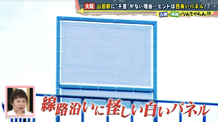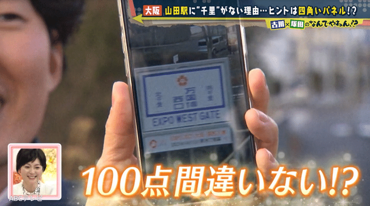 さっそく周辺地域をくまなく調査した塚田と古川アナは、線路沿いに謎の白いパネルを発見した。乗車客向けに設置しているものらしく、塚田が電車に乗って写真を撮ると、パネルには北千里と南千里に挟まれて、「万国博西口」と書かれてあった。この写真から2人は、1970年に開催された日本万国博覧会(大阪万博)をひらめき、山田駅はもともと万国博西口駅だったと推測。大阪万博の開催終了後に、駅がある「山田」という地名に変えたのではないかと結論付けた。