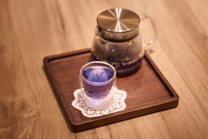 席に着くとまず、セットのあざやかな「鎌倉ブレンドティー」が提供されます。その色の美しさに驚き! これは、鎌倉の雄大な自然と色鮮やかなアジサイをイメージしたもの。大河内煎茶とハーブがブレンドされ、さわやかな甘みのなかにほんのりと柚子が香ります。食事との相性もいい、さっぱりとした味わいです。