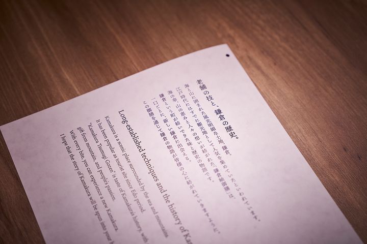 鎌倉の名店の味をゆっくりと味わえる、ぜいたく御膳。敷いてある紙に番号が振られているのは、美しく配膳するための工夫だそう。味だけでなく見た目の美しさにもこだわりが感じられます。