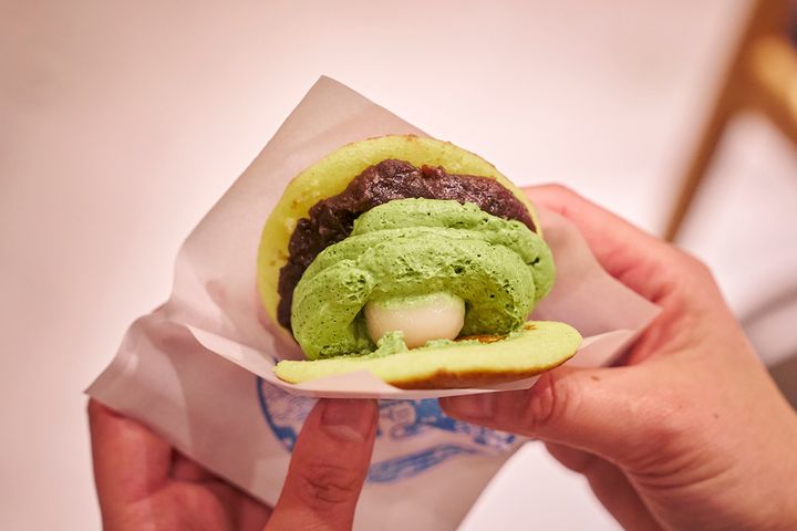 中には抹茶ムースとしっかりとした粒あんがたっぷり。ぷるぷるとした白玉と固形バターも入っています。すべての味が絶妙に絡み合い、上品な甘さ。食事の後でもぺろりと食べられてしまいます。