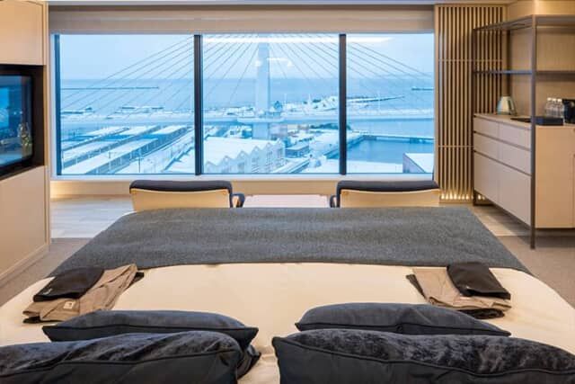 ベッドからは大窓を通して青森駅周辺のベイエリアを眺望。市のランドマークのひとつ青森ベイブリッジが目の前に迫り、その先には陸奥湾が広がります。