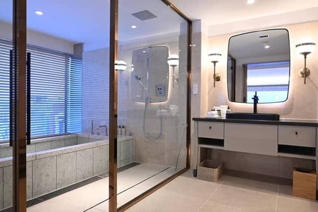 黒い水栓や洗面、バックライトで照らされた大きな鏡などデザイン性が高く、ガラス張りのバスルームも備えます。