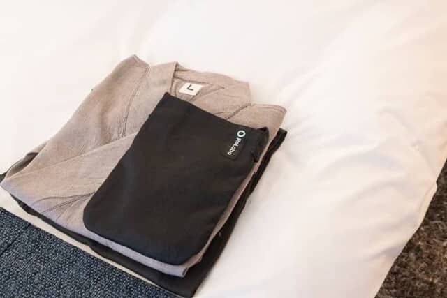 肌触りのいい室内着兼パジャマは、大浴場へも着て行けます。大浴場にはタオル類が置かれているので手ぶらで向かいますが、化粧品などちょっとした小物を入れられるサコッシュも用意します。
