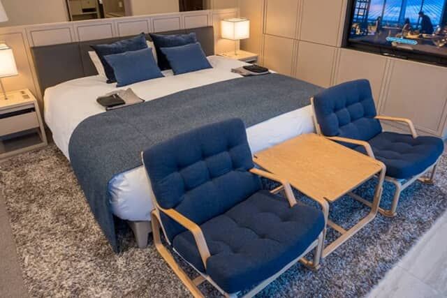 132平米の広さを誇る「エンペラースイート」は、リビングからは駅周辺の街並みを見下ろし、寝室ではベイエリアを一望。シックでモダンな家具をそろえ、ミニキッチンも備えます。このほか66平米のジュニアスイートも用意しています。
