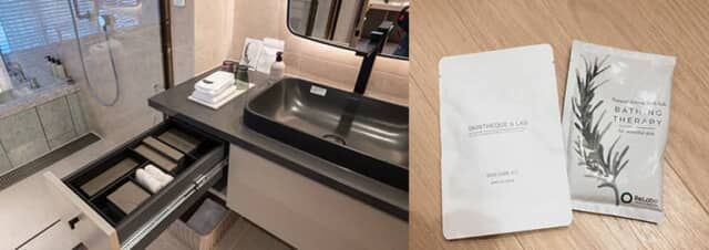 エンペラースイートとジュニアスイートには箱入りのアメニティをそろえ、タオル類は今治タオルを採用。スキンケアセットは「スキンテーク&ラボ」。ホテルオリジナルの入浴剤を備えるなど、部屋での入浴もちょっとした特別感を味わえます。
