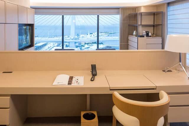 広いデスクも備え、景色を見ながらデスクワークもできます。