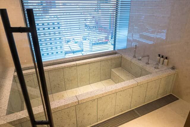 エンペラースイートのバスタブのみ秋田県で産出される十和田石が使われます。窓からは青森駅前のロータリーや街の風景を見下ろせます。