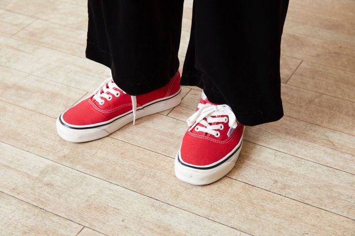 「オーセンティックの平たい形が好きで、色違いで何足も持っています。シューレースで甲の調節ができるのではきやすいのもポイント。今日はコートの赤とリンクさせてアクセントにしました」