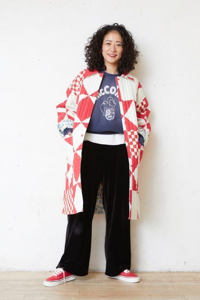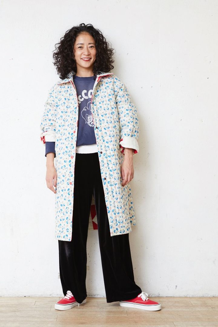 存在感たっぷりのキルトコートを主役に、遊び心あふれる小笠原さんの着こなし。