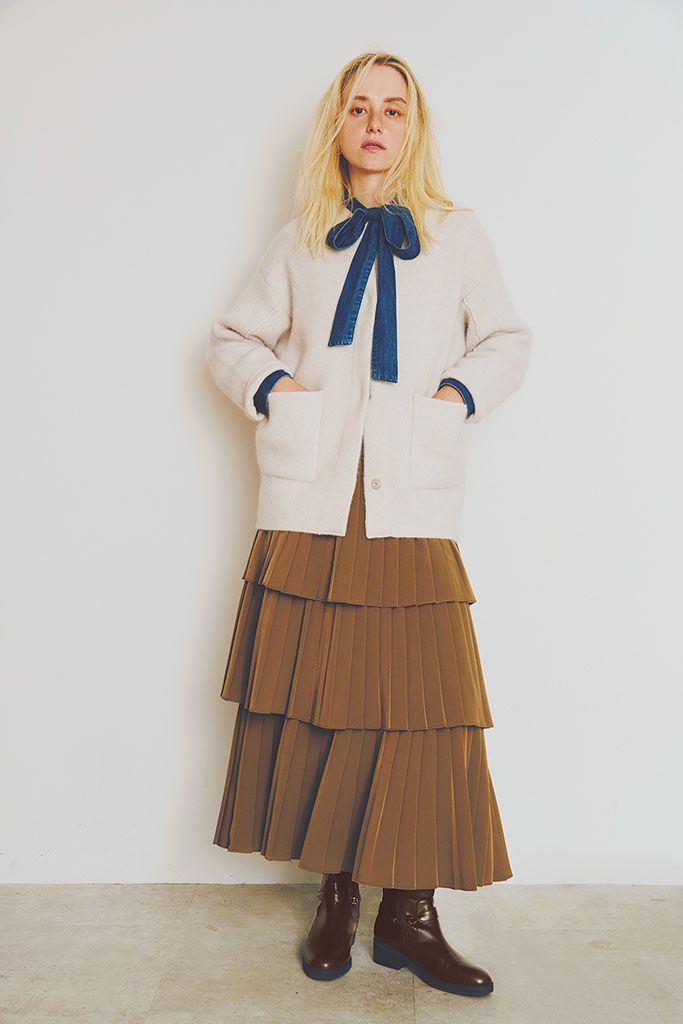 落ち感のある素材にプリーツ加工をほどこしたティアードスカート。スカートのゆれに合わせて鈍く光を反射する微光沢な質感が、大人っぽい苦みを含んだ深みのあるたたずまいを演出。装いに奥行きを生む立体デザインは、脚線を目立たせないスタイルカバーにも寄与。