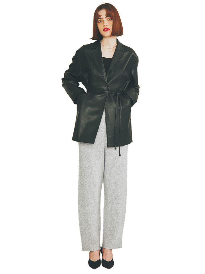 ライダースほど無骨すぎず、欲しい緊張感だけが身につくレザー素材のジャケットコート。ウエスト部分についた華奢なベルトは、簡単にくびれをつくれるほか、それとなく垂らすだけでも女っぽさをかもせるメリットの多いギミックつき。お尻が隠れるくらいの丈感でスタイルカバーにも貢献。 黒レザーコート/MANOF ニットパンツ/Ungrid