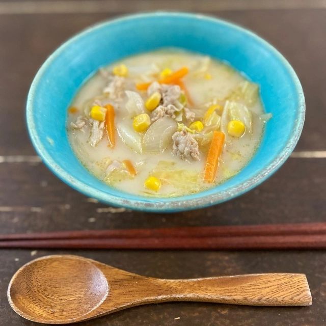 「野菜たっぷりちゃんぽんスープ」は、おでんだけでは不足しがちな栄養がしっかり補える一品。豚肉、ごま油、コーン 、にんじん、牛乳など、体に必要な5大栄養素の食材が入っています。