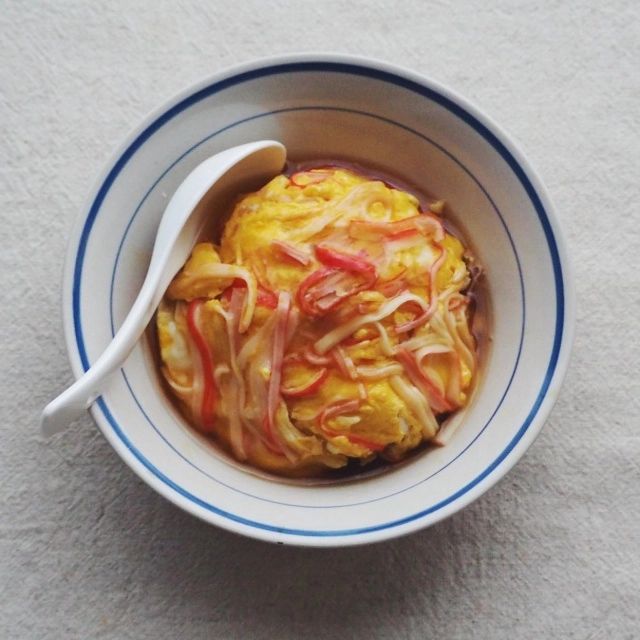 半熟卵とあんがトロトロでおいしい「カニカマ天津飯」は作り方も簡単!溶いた卵にほぐしたカニカマを入れ、多めの油で焼きます。卵が半熟の状態で火を止めるのが、おいしく作るコツ。同じフライパンであんも作れるので、洗い物が少なく済んで時短になります。