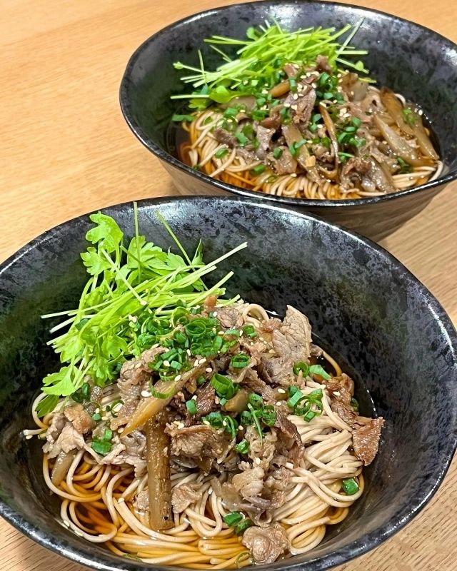 牛肉とごぼうを甘辛く煮て、蕎麦の上に盛りつけた「新ごぼうの牛しぐれ蕎麦」。味がしっかりついた牛しぐれ煮は、あっさりしたおでんとの相性も◎水菜や三つ葉を乗せると、彩りもキレイになりますよ。