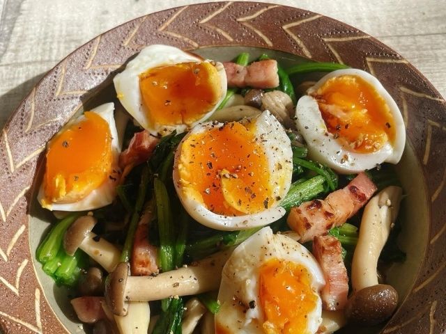 ほうれん草としめじのシャキシャキとした食感と、ベーコンの塩気がたまらない一品!食卓が茶色くなりがちなおでんですが、ほうれん草の緑や卵の黄色が食卓に彩りを与えてくれますよ♡