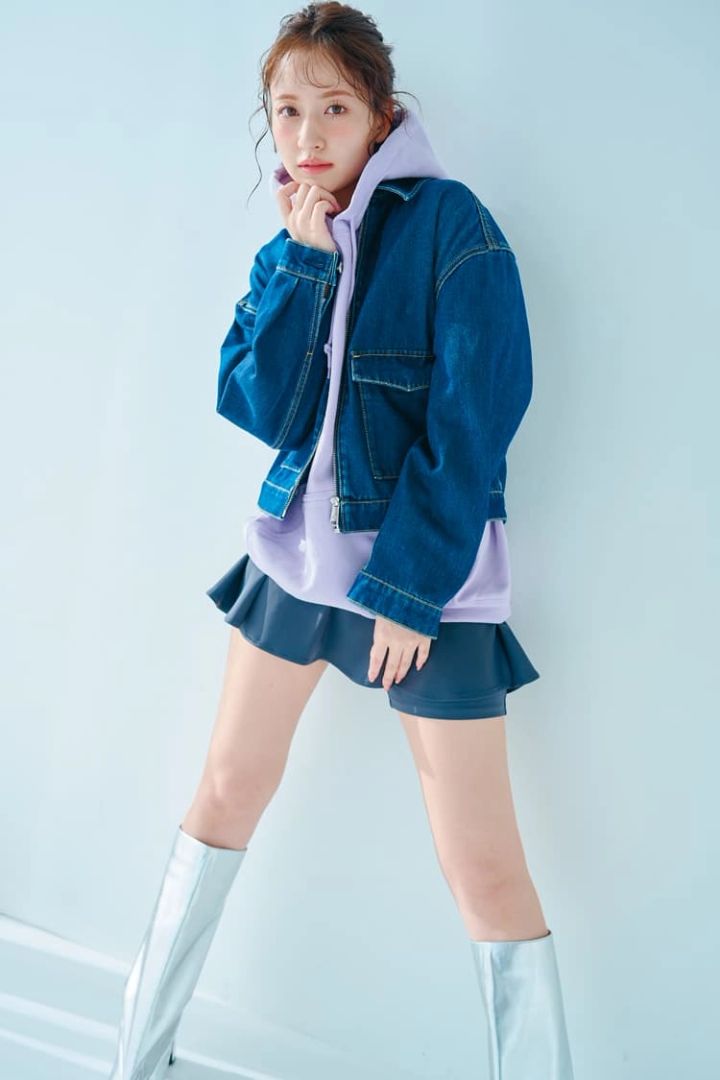 パーカとデニムのカジュアルコンビに、ミニとメタリックブーツをあわせて、ぷりかわなスタイルに落とし込んだスタイル。淡~いパープルカラーがアクセントに。