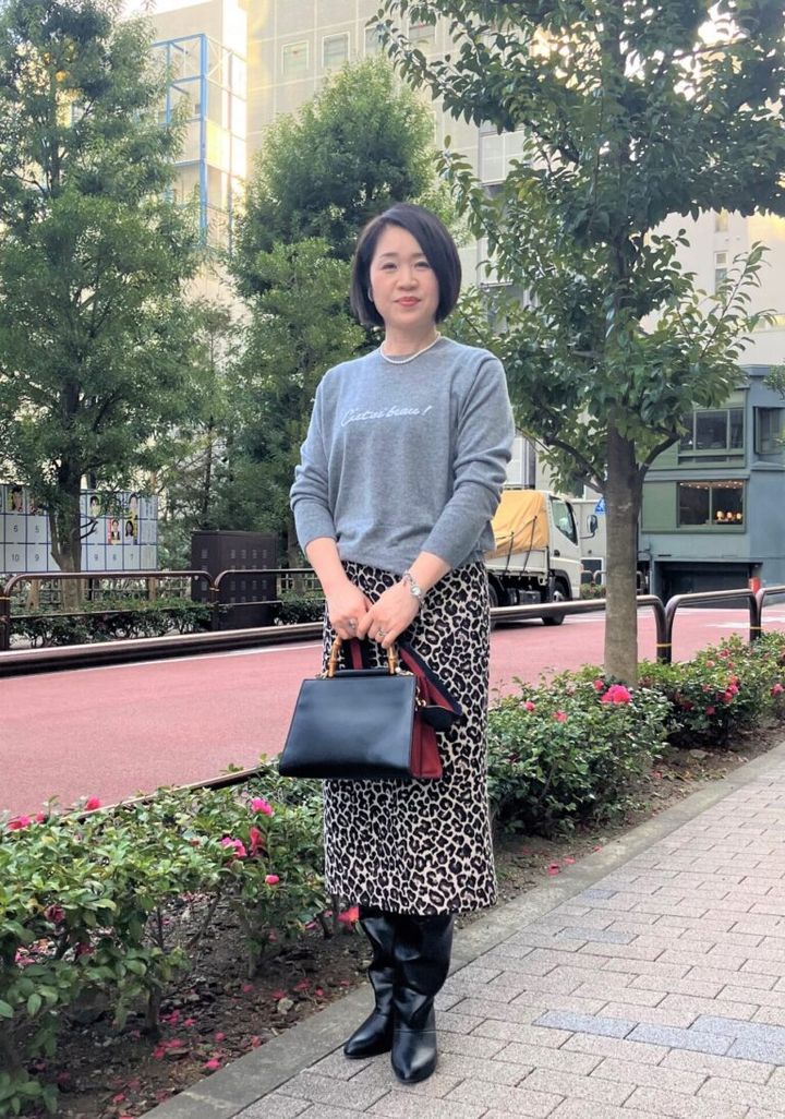 おしゃれでは、「バランスを大事にしている」というてるみさん。この日は、旬のショート丈のコートに縦長シルエットのボトムスを合わせて、すらりとした印象が際立つ装いに。「カジュアルにも着られるロゴニットとレオパードスカートに、パールのネックレスでエレガントさをプラスして、上品カジュアルを意識してみました」