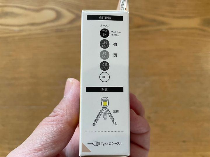 ブースターモード(250ルーメン)は1時間、強モード(180ルーメン)は1.5時間、弱モード(60ルーメン)は3.5時間、点滅モードは0.5時間点灯できるそうです。