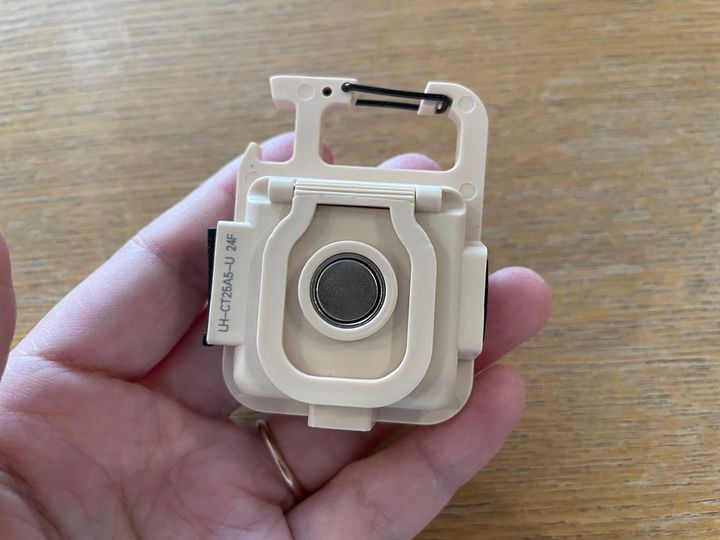カラビナがついているので、バッグに取り付けたり、スタンドで立てかけたり、マグネットで貼り付けることもできます。