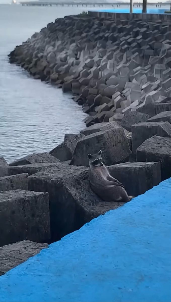 海辺のテトラポットに腰掛けているアライグマ。 しかも、ただ座っているだけではありません。