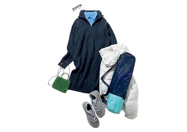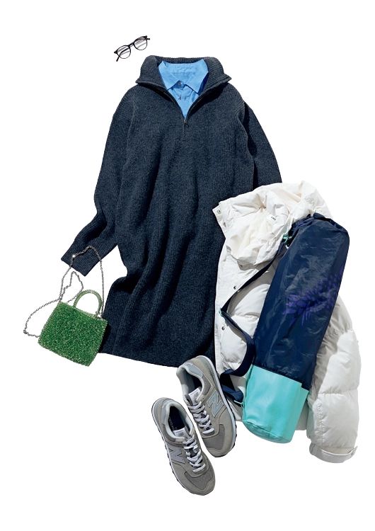 ショートダウンジャケット¥24,970/LILY BROWN(LILY BROWN ルミネエスト新宿店) シャツ¥5,489/ロペピクニック(ジュン) ニットワンピース¥4,990/UNIQLO ミニバッグ¥36,300/アンテプリマ/ワイヤーバッグ(アンテプリマジャパン) スニーカー¥11,990/ニューバランス(ニューバランスジャパン) メガネ¥12,000/OWNDAYS マット/編集部私物