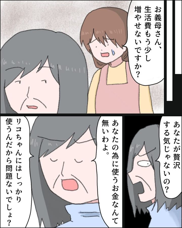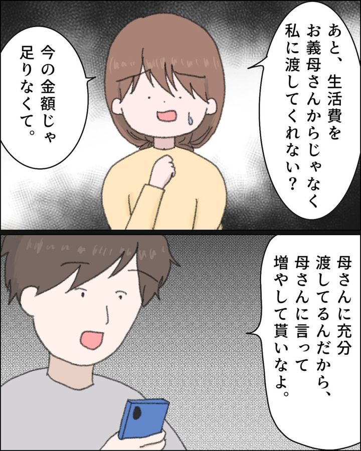 「あと、生活費をお義母さんからじゃなく私に渡してくれない?今の金額じゃ足りなくて」とミサキさんが言うと、
