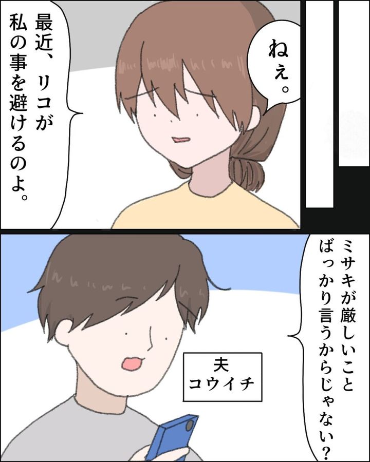 「ねぇ。最近リコが私の事を避けるのよ」そう伝えると、「ミサキが厳しいことばっかり言うからじゃない?」とスマホを見ながら答えるコウイチさん。
