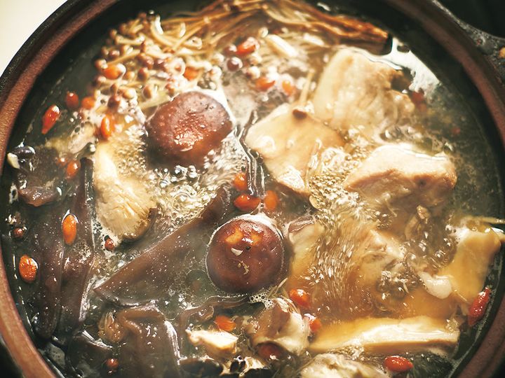❶ 豚バラブロック(3㎝の厚さに切る)・にんにく3片・しょうが・長ネギ青い部分・クコの実・なつめ・干し椎茸・花椒・紹興酒・塩と水を鍋に入れ、豚肉が柔らかくなるまで煮る(圧力鍋で20分加圧でもOK)。