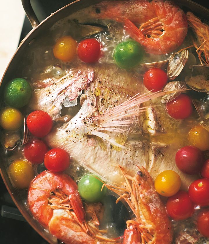 ❷ お好みの魚介(今回はチダイ・えび・ムール貝・アサリ)と白ワインを加え、蒸し焼きにする。