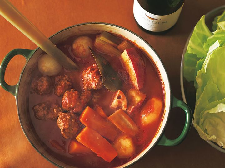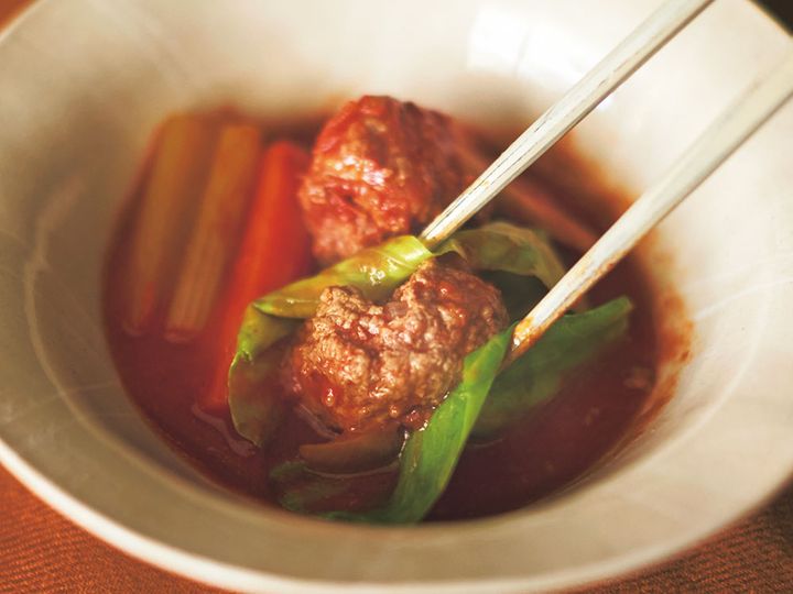 私の帰りが遅くなる時に作り置きしておく定番鍋。スープでキャベツをしゃぶしゃぶして肉団子を包んで即席ロールキャベツ風にしていただきます。(内山さん)