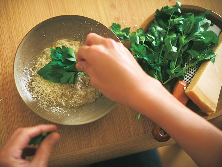 シメのリゾットにはパルメザンチーズをその場ですりおろして加えると香り高く、味変もできます。仕上げにはフレッシュのイタリアンパセリを添えると、レストラン風の本格的な味に。