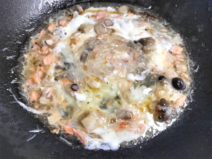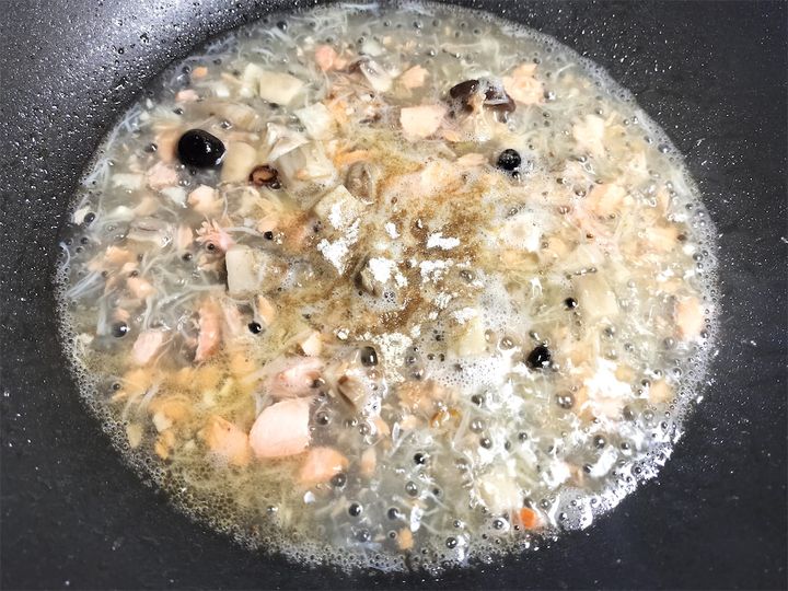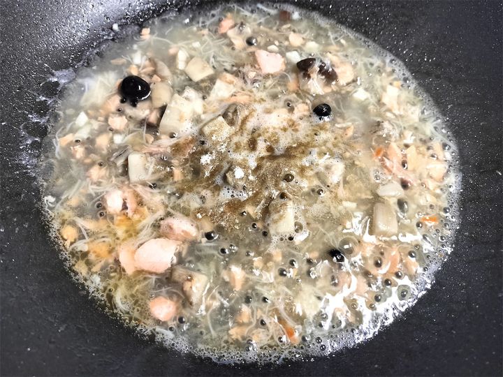 4. 同じフライパンに脇屋シェフ特製の鮭ときのこのXO醤を入れて炒めます。