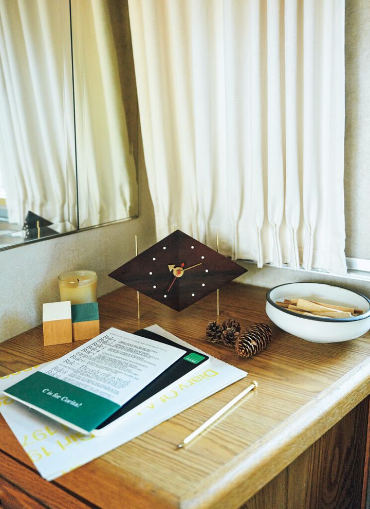 新しい年のスタートとともに、部屋のムードも変えようと思い、〈ヴィトラ〉の「ダイアモンドクロック」を迎え入れた。ミッドセンチュリーを代表するデザイナー、ジョージ・ネルソンが1947年に手がけたもので、3本の細い金属の柱で支えられたボディは、まるで宙に浮いているよう。針と点のみで構成されたシンプルな文字盤が、見る角度によって豊かな表情を見せる。オブジェのようでいて、あたたかみのあるウォールナット製だから、周りの家具ともよく馴染む。¥72,600(ヴィトラ 0120‒924‒725) その他スタイリスト私物