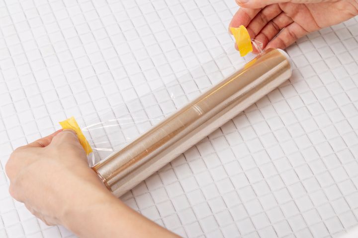 両端に貼ったマステをかるくひっぱりながら持ち上げると、ラップを破かずに巻き終わりを浮かせることができますよ。