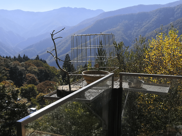 テラス席の横に設置された餌台に小鳥が来ている様子も見れました。 お店の方が鹿もときどき来るよと教えてくれたので、下を覗いてみると……いました!