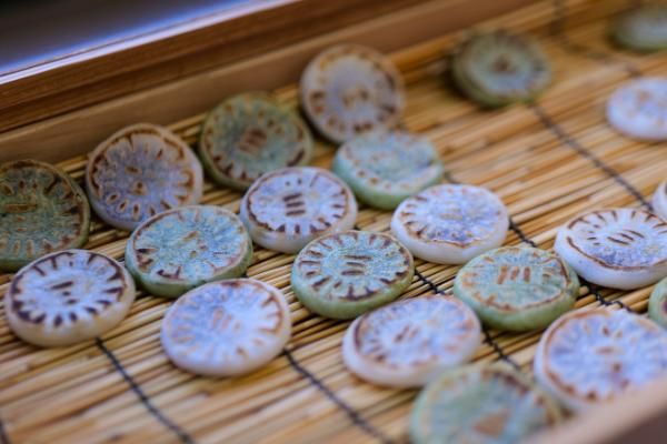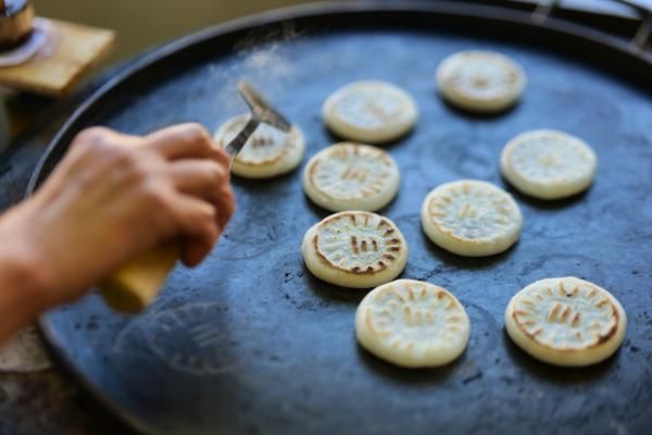 こし餡を包んで、屋号の入った木型でペッタンコに伸ばしてから、鉄板で片面5分ほど焼きます。