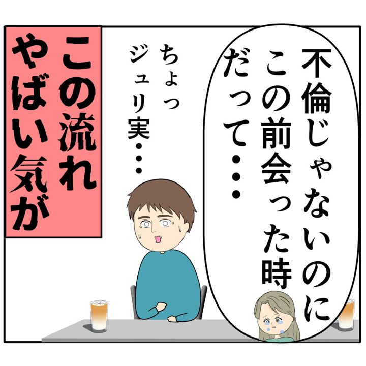 ジュリ実さんは「不倫じゃないのに。この前会った時だって・・・」と泣きながら話し始めます。感情的になっているジュリ実さんの様子に「この流れ、やばい気が」とろみ緒さんが思っていると、