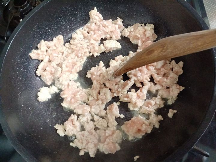 3.鶏ひき肉をゴマ油で炒める。味付けに塩、こしょうをお好みで振る。