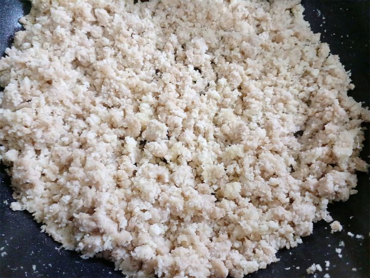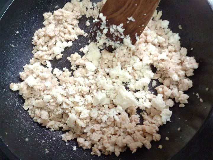 4.鶏ひき肉に火が通ったら、おからを少しずつ入れ、全体に馴染むように炒める。