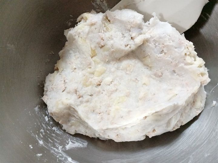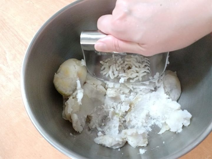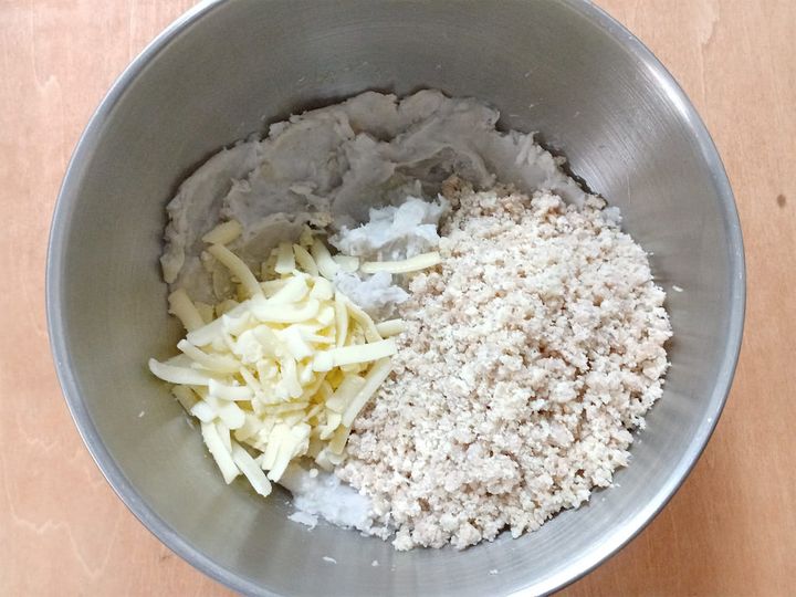 5.2のつぶした里芋に、4のひき肉とチーズを入れて、よく混ぜる。