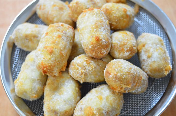 フライパンに揚げ油を入れて170℃くらいに熱し、6の里芋をきつね色になるまで揚げる。