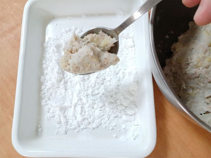 6.片栗粉をバット等に薄く敷き、5の里芋をスプーンで一口大に取り、片栗粉をまとわせながら俵型に形を整える。